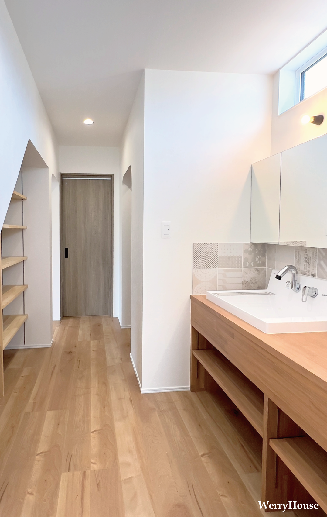 家族用のプライベート動線には大容量のオープン収納を設けました(左) ランドリールーム・洗面コーナー・パントリー・脱衣室が、プライベート動線を通じて一直線に並ぶ一周できる快適プラン(右) |