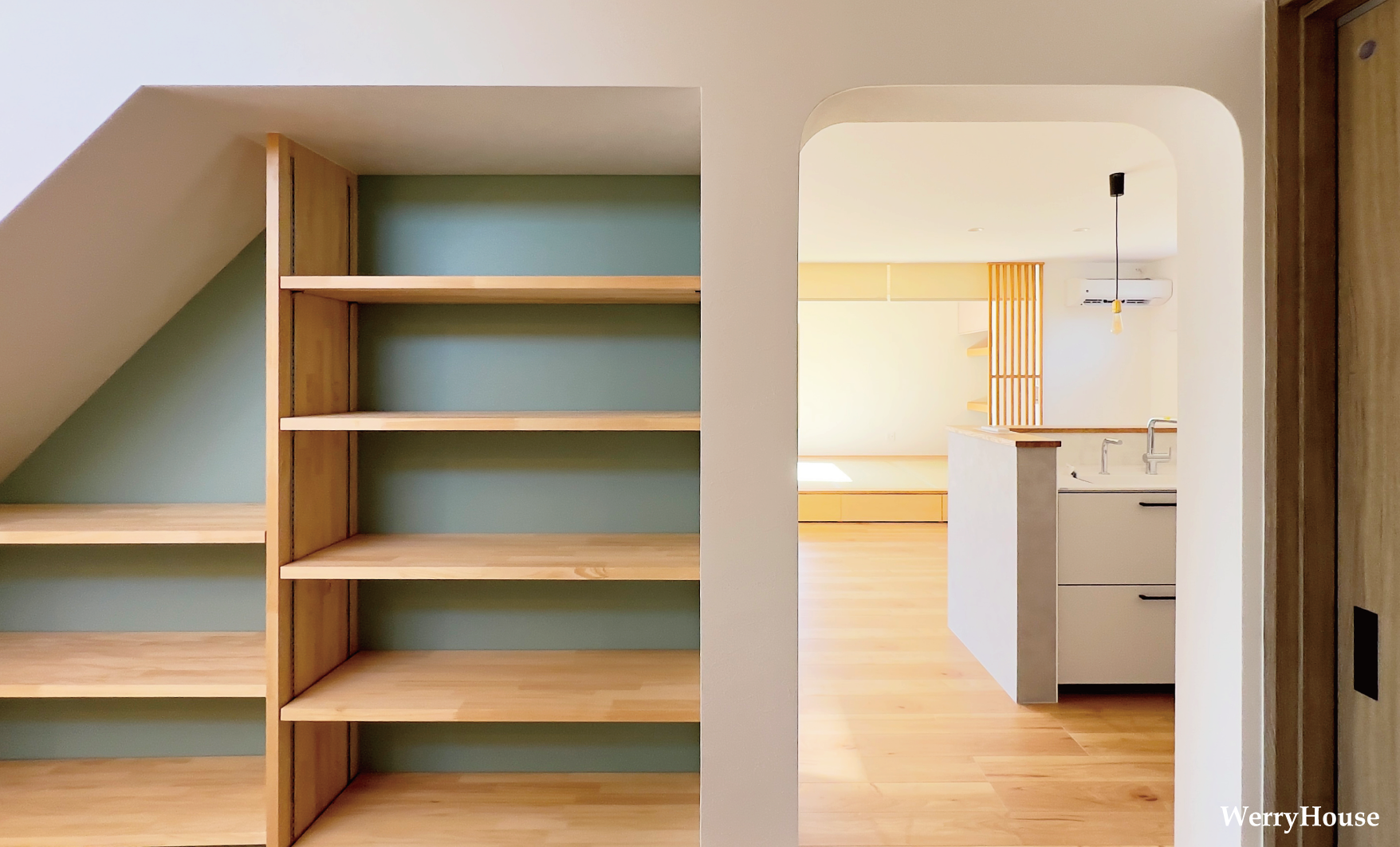 | 普段はオープンに使え、来客時やお昼寝時は閉じられるよう埋込ロールスクリーン間仕切りを採用。 スッキリ使えて、コストダウンにも繋がります。 |